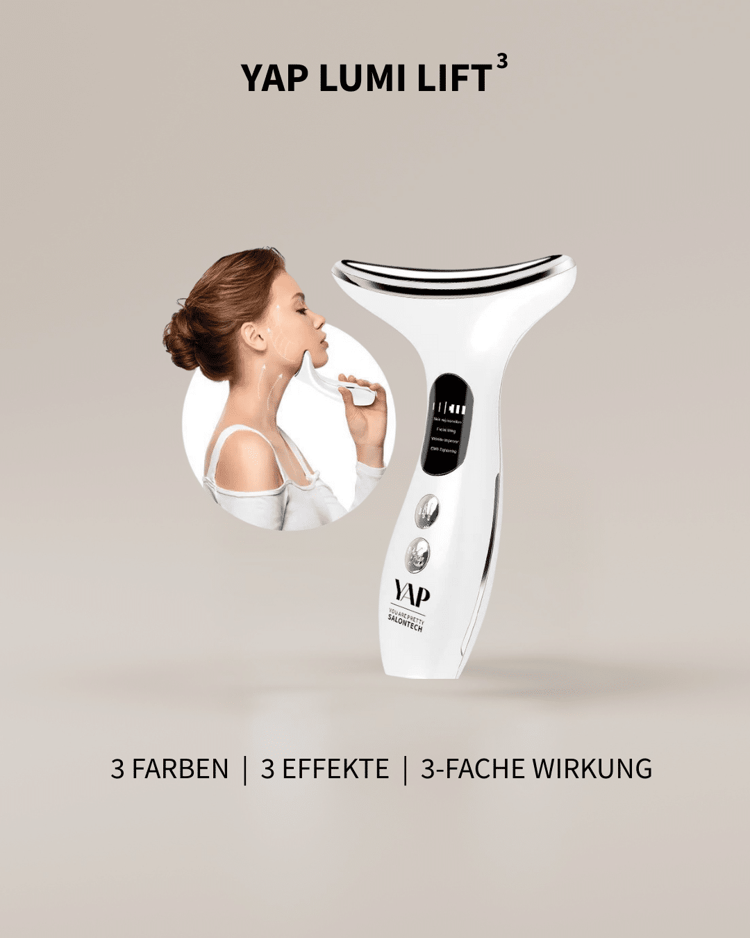 Der YAP Lumi Lift³ ist ein smartes LED- und EMS-Liftinggerät für Gesicht und Hals mit 3-facher Wirkung. Die Kombination aus Mikrostrom (EMS), thermischer Wärme (45 Grad) und 3-farbiger LED-Lichttherapie unterstützt die Hautregeneration und -straffung, steigert die Durchblutung und den Hautstoffwechsel, reduziert Entzündungen und sorgt für einen schönen, glatten Glow. Ideal für die tägliche Schönheitspflege oder als besonderes Me-Time-Ritual in Kombination mit den effektiven YAP-Hautseren.